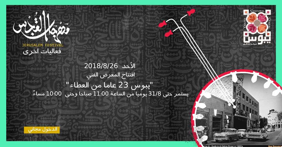 بعد 23 عاماً على تأسيس مركز يبوس الثقافي، ومع استكمال مراحل ترميمه، وبمناسبة افتتاح قاعة فيصل الحسيني، وانطلاق مهرجان القدس 2018 ، ينظم المركز معرضاً يوثق بصور فوتوغرافية تطور مسيرة «يبوس » منذ التأسيس في العام 1995 وحتى هذا العام 2018 .