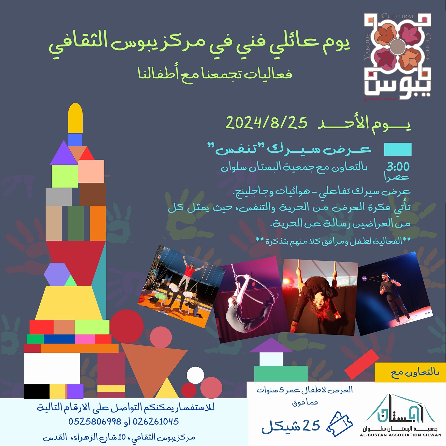 مركز يبوس الثقافيأطلق العنان لإبداعك في مخيمنا الشتوي الفني الثقافي! شاركونا "دفى القدس" وانغمسوا هذا الشتاء في مزيج فريد من الفن والثقافة والموسيقى! للأعمار من 6 حتى 12 سنة يومياً من يوم […]